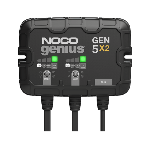 Meet the all-new GEN5X2. Similar to our GENM2, only better. It’s 27% smaller and delivers 43% more power. It’s one of the best performing onboard marine battery chargers we have ever made. A two-bank onboard battery charger rated at 10-amps (5-amps per bank) for 12-volt batteries, including marine, boat, starter, and deep-cycle batteries. Independently charge and control each battery bank with selectable charging modes – including 12V, 12V AGM, 12V Lithium, and 12V Repair Mode – for all types of lead-acid and lithium-ion batteries.